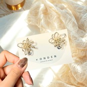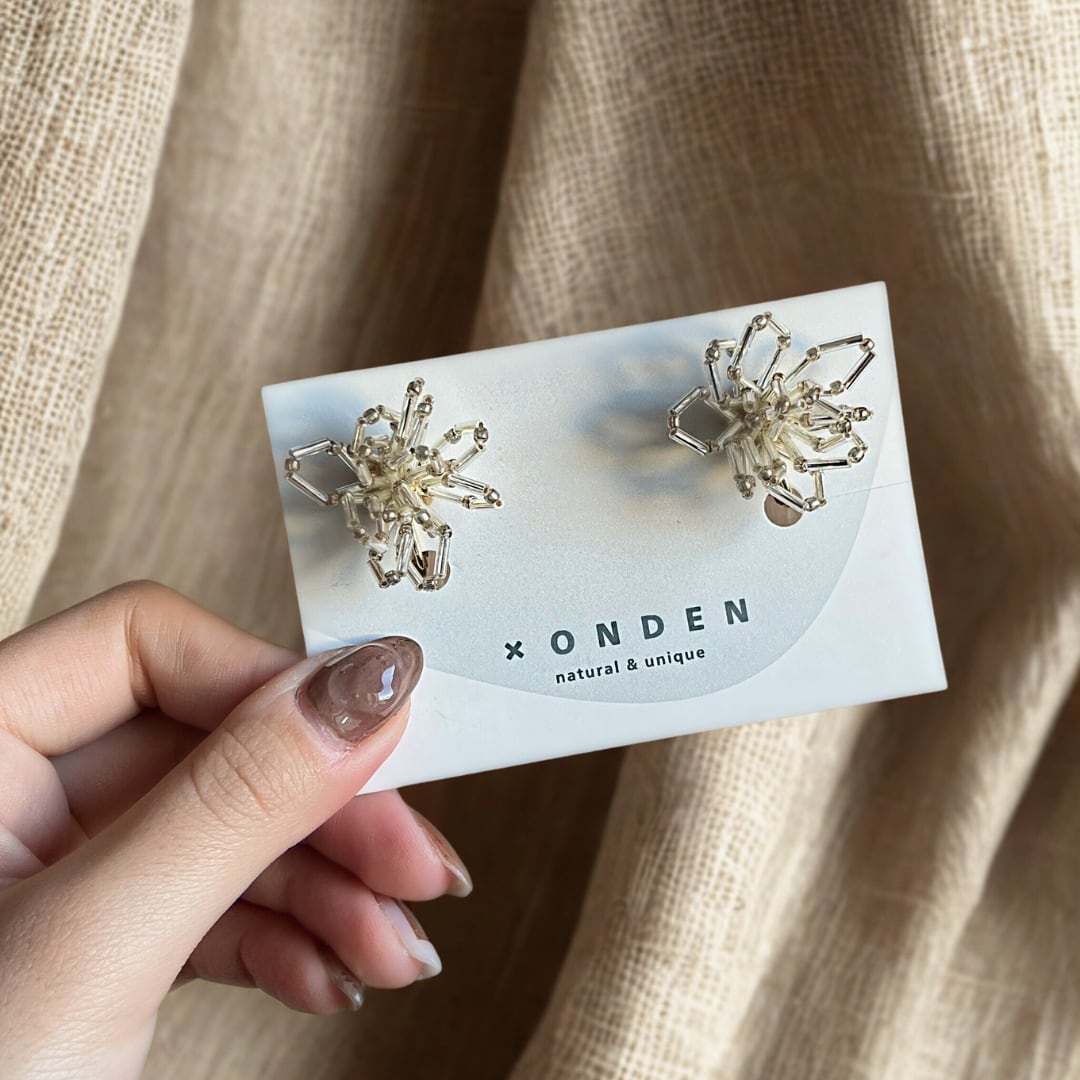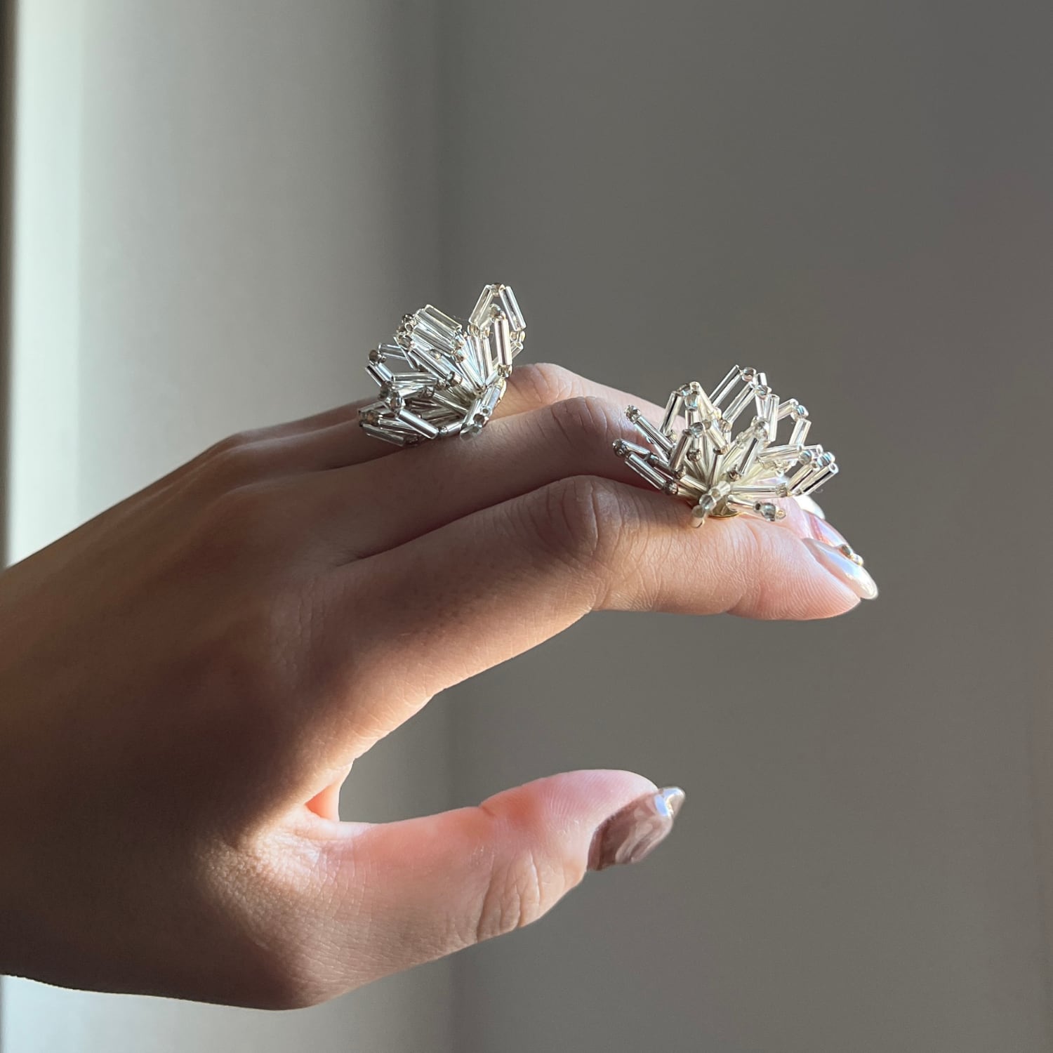 透明で繊細な美しいガラスビーズを使用したイヤリング。花弁のように広がるビーズと透明感が目を引くアクセサリーです。
